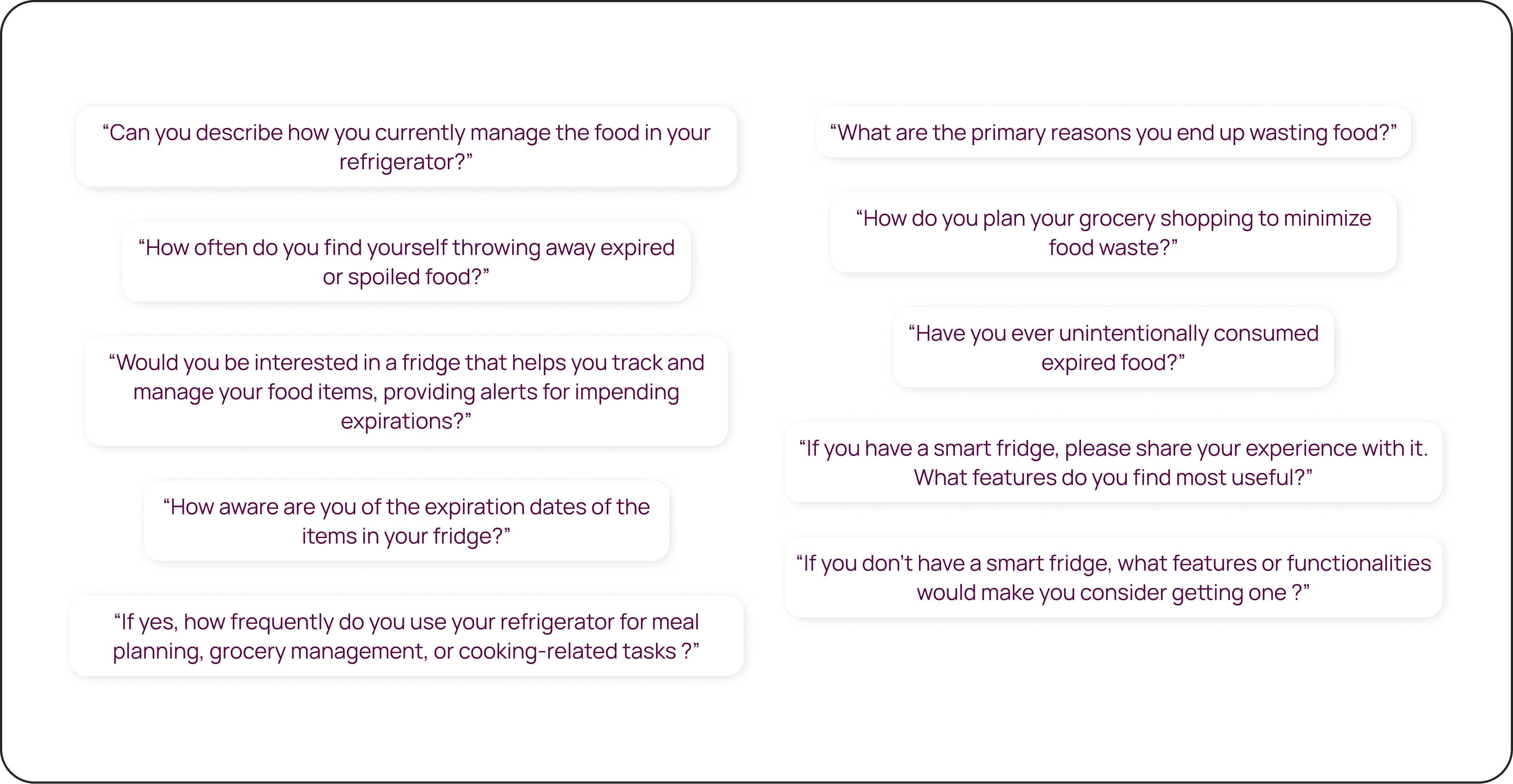 Interviewed five potential consumers to assess the extent of the food waste problem, and the following questions were asked.