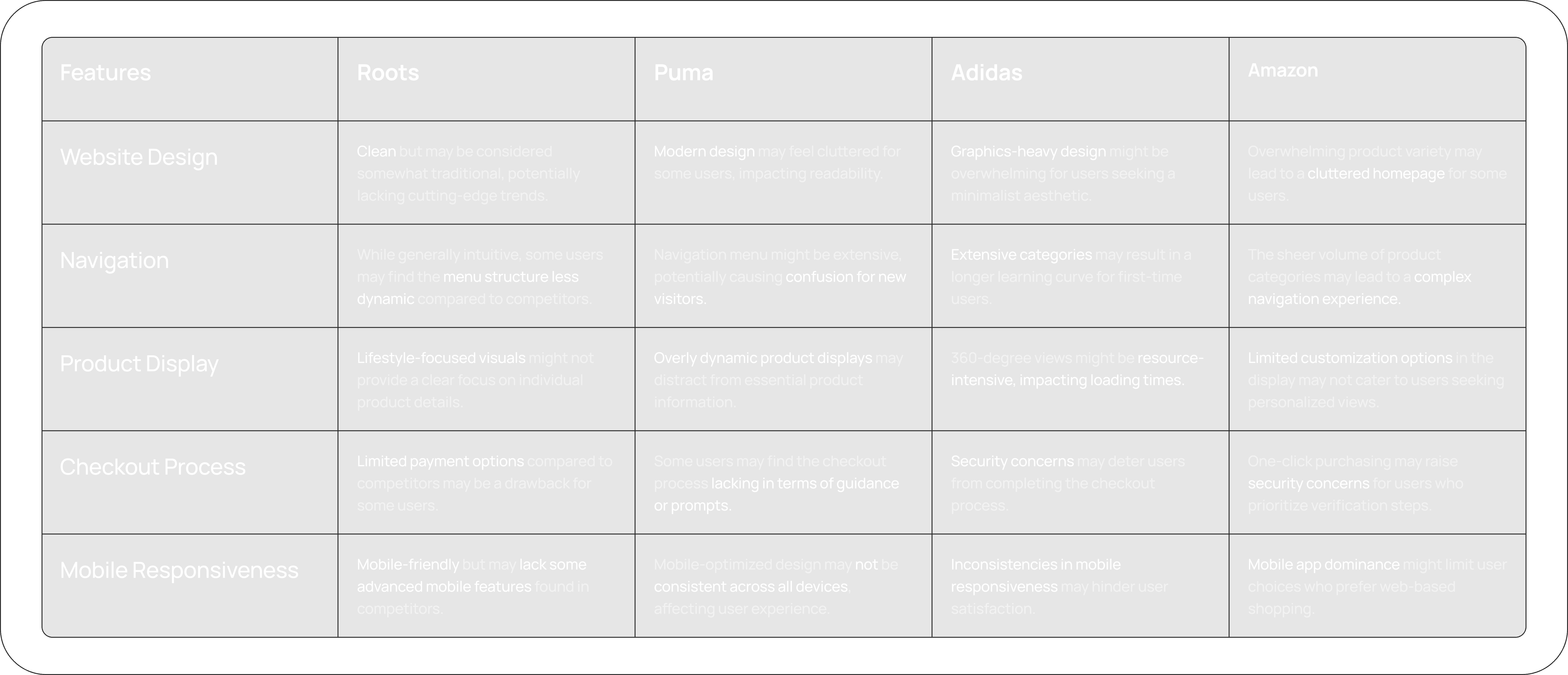 We performed a competitive analysis to identify problems users might encounter on the Roots Canada website. Initially, we considered Puma, Amazon, and Adidas as key competitors for this analysis, given their established status. We believed that examining these websites would provide valuable insights for our assessment. The criteria chosen were