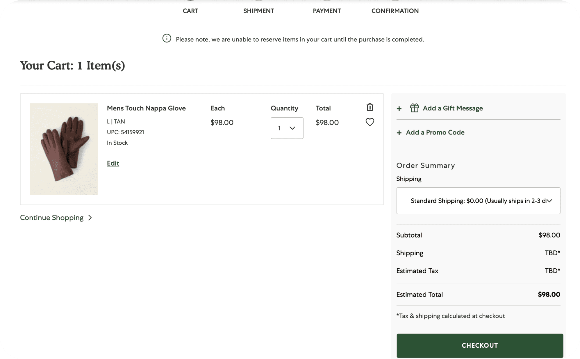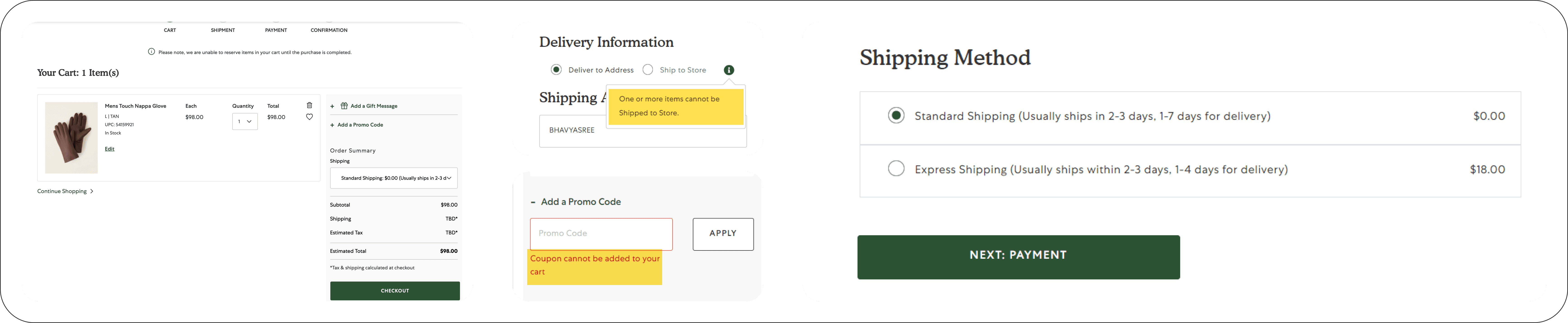 The website fails to display shipping charges and tax amounts before advancing to the checkout, and there is no option to input a PIN code to verify the item's deliverability. The label 'Next: Payment' on the button appears confusing; it could be improved by changing it to 'Proceed' or 'Proceed to Payment' for better clarity.