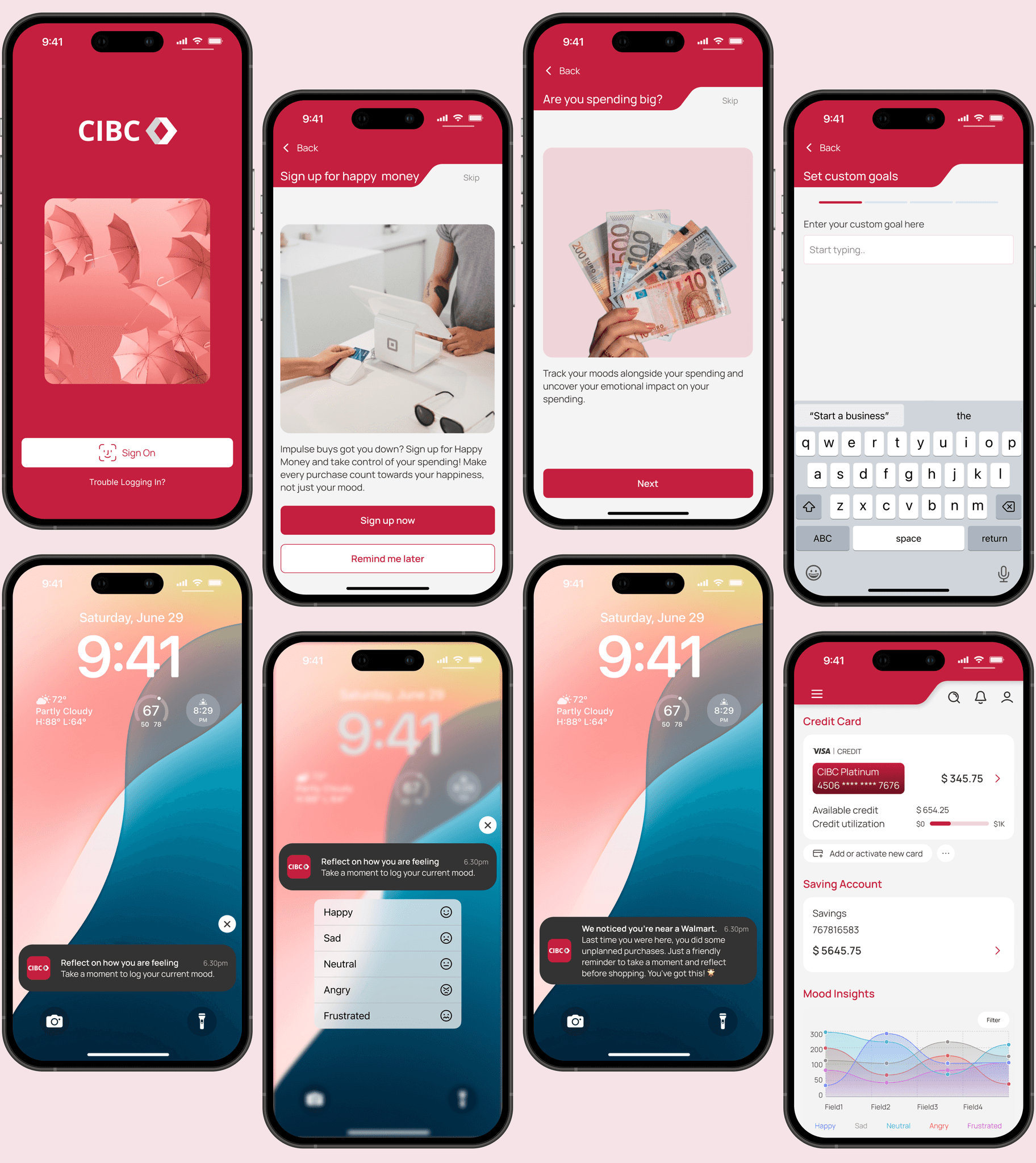 We propose a new feature called "Happy Money" for the existing CIBC app. This feature would help users manage their mood spending—how their emotions influence their spending habits—by providing tools and insights to encourage more mindful and informed financial decisions.